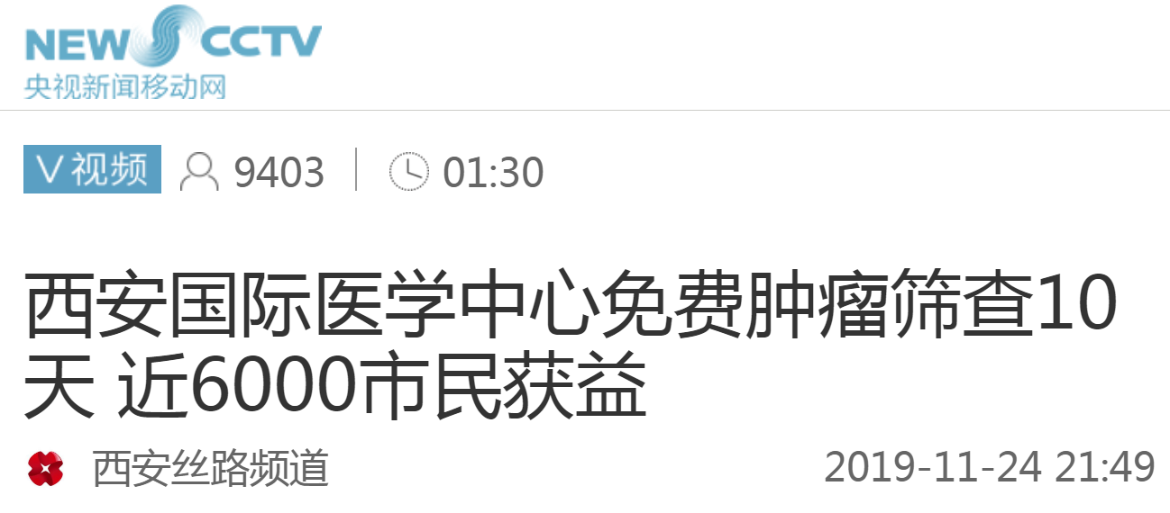 央視新聞移動(dòng)網(wǎng)報(bào)道—西安國(guó)際醫(yī)學(xué)中心免費(fèi)腫瘤篩查10天 近6000市民獲益。點(diǎn)擊閱讀。
