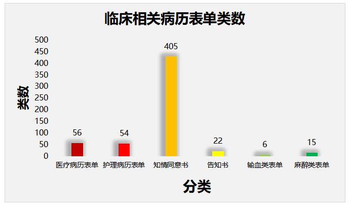 根據(jù)JCI第六版評審標準,完成JCI相關(guān)醫(yī)療病歷表單類56類,JCI相關(guān)護理病歷表單54類、知情同意書405類、告知書22類、輸血類表單6類、麻醉類表單15類,總計583類。如圖所示: