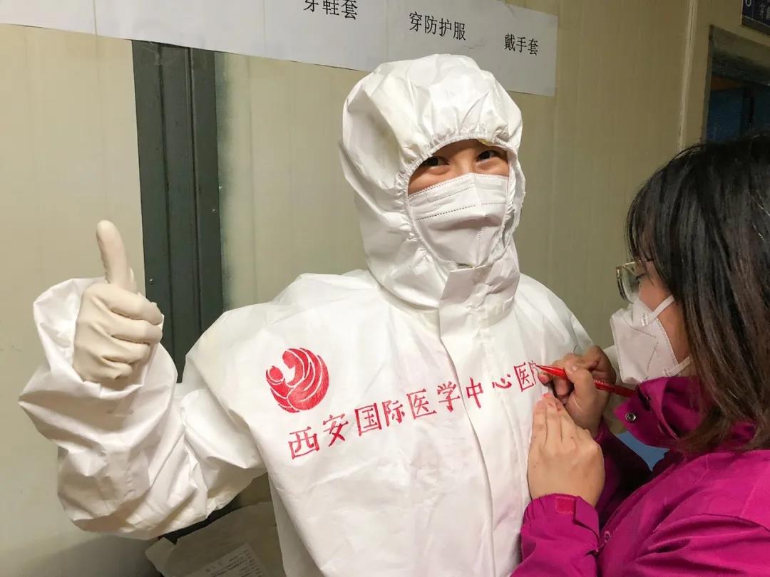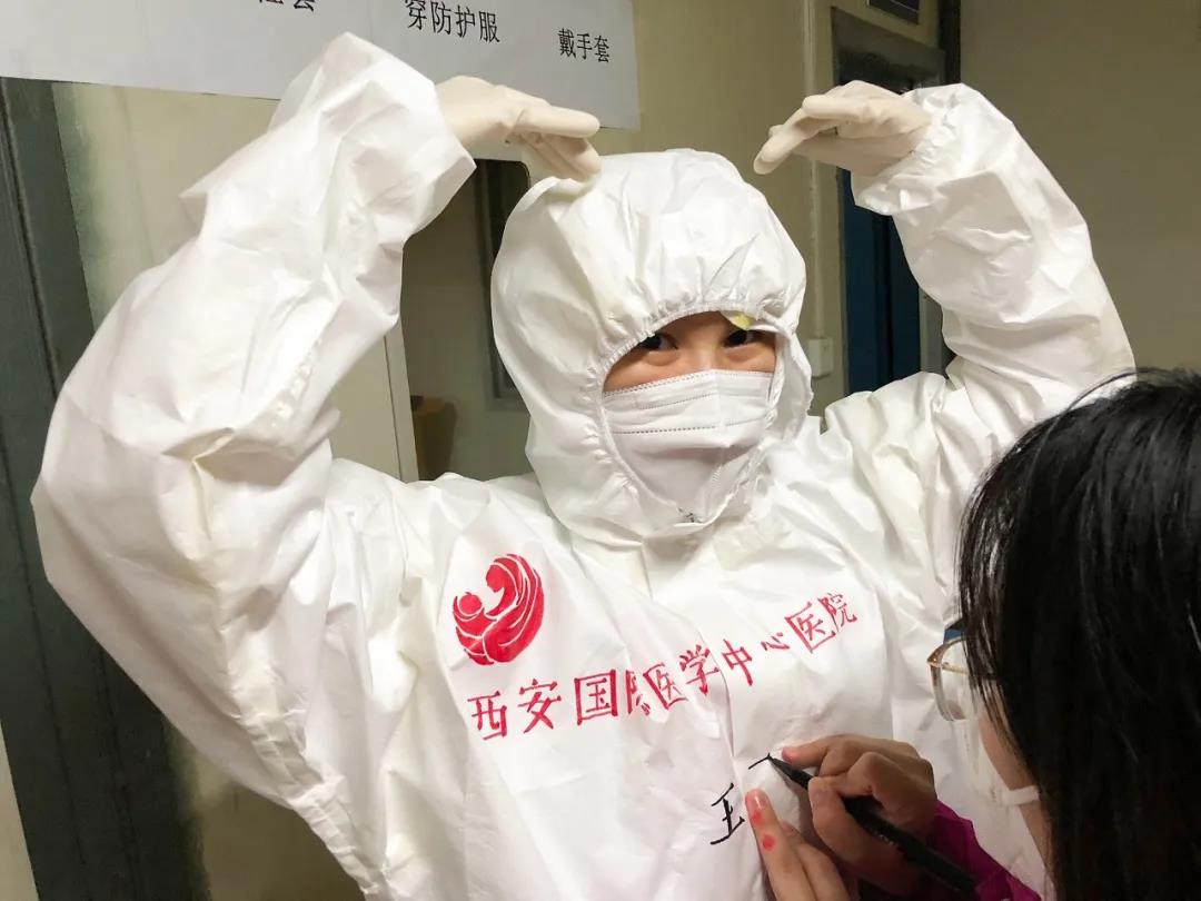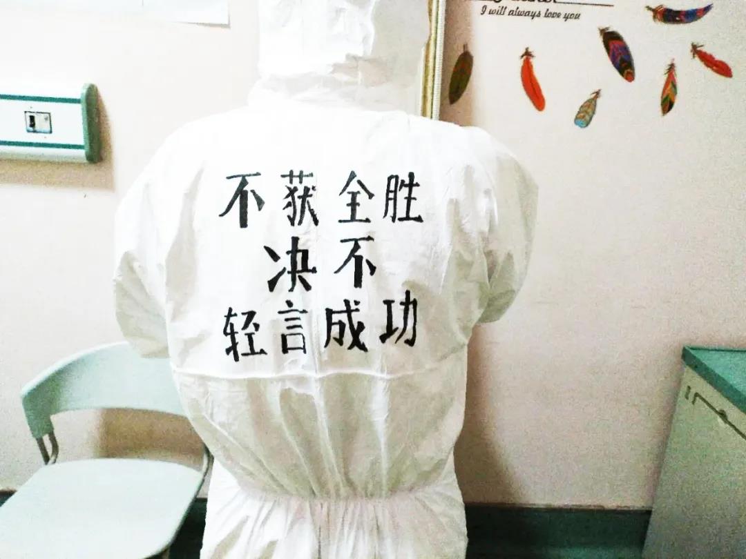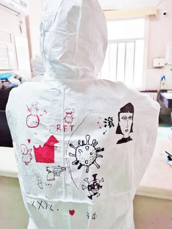 西安國(guó)際醫(yī)學(xué)中心醫(yī)院援鄂醫(yī)療隊(duì)醫(yī)護(hù)隊(duì)員都有一身特別的白袍,手繪版防護(hù)服上有國(guó)際醫(yī)學(xué)的logo?!安猾@全勝絕不輕言成功”、“武漢加油”的娟秀字跡提升士氣,醫(yī)護(hù)人員擊敗新冠病毒的漫畫也鼓舞人心。