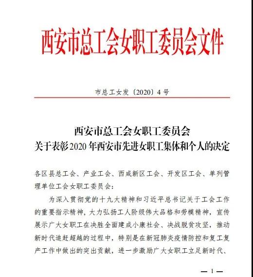 西安市總工會(huì)在《關(guān)于表彰2020年西安市先進(jìn)女職工集體和先進(jìn)個(gè)人的決定》指出,在抗擊新冠肺炎疫情的關(guān)鍵時(shí)刻,薛妍副院長(zhǎng)主動(dòng)請(qǐng)纓馳援武漢、隨州兩地。在戰(zhàn)斗中時(shí)刻以高度的責(zé)任意識(shí)和擔(dān)當(dāng)精神做好每項(xiàng)工作。在武漢第八醫(yī)院,她參與專家組工作,規(guī)劃救治重點(diǎn)及工作流程,制定診療方案,保證各項(xiàng)工作順利展開(kāi)。在隨州市中心醫(yī)院,她負(fù)責(zé)醫(yī)療隊(duì)的后勤保障以及隊(duì)員們的衣食住行,被隨州市委授予“抗擊新冠肺炎疫情先進(jìn)個(gè)人”榮譽(yù)稱號(hào)。