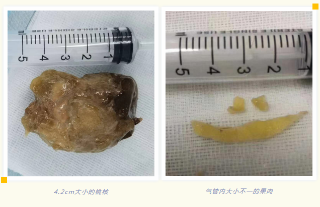 入院到治療結(jié)束,不到兩小時(shí)就取出4.2cm大小的桃核以及氣管內(nèi)大小不一的果肉。