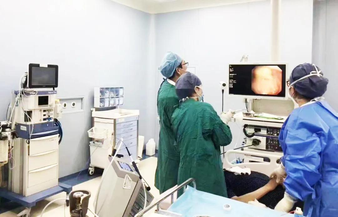 呼吸內(nèi)科二病區(qū)韓新鵬主任得知后,考慮患者存在氣管內(nèi)異物,需緊急處理,第一時(shí)間匯報(bào)胸科醫(yī)院吳昌歸院長(zhǎng),并立即趕赴醫(yī)院,部署各項(xiàng)工作。在吳昌歸院長(zhǎng)的指導(dǎo)下,韓新鵬主任帶領(lǐng)科室團(tuán)隊(duì)(樊建勇副主任醫(yī)師、張黎媛主治醫(yī)師、氣管鏡室陳娟等人),為患者實(shí)施“電子支氣管鏡冷凍治療術(shù) 異物取出術(shù)”?;颊呷朐翰坏?小時(shí),就徹底解決了呼吸道阻塞的問(wèn)題。