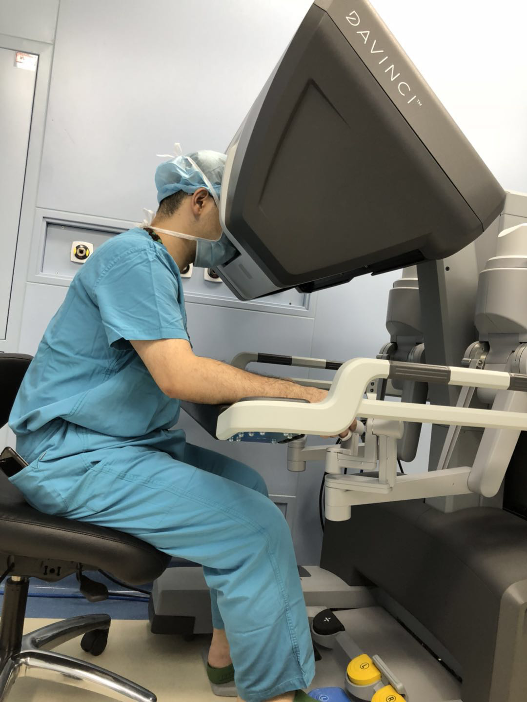 蔡磊主任介紹,達芬奇機器人手術與腹腔鏡相比對病人創(chuàng)傷更小,操作更加精細,能更清晰的解剖并游離血管,更精準的清掃淋巴結,損傷和出血更少,術后恢復快,手術效果更好,住院時間更短?!拔覀兊倪_芬奇機器人是第四代,可將手術部位放大15倍,且為裸眼高清三維成像,與腹腔鏡比成像更加穩(wěn)定,更加清晰,達芬奇機器人可完全模仿人手腕動作,并具有人手無法比擬的穩(wěn)定性和精確度,活動范圍甚至超越人手,在狹小的空間里能夠更加精準的完成操作。希望更多的患者能夠了解達芬奇機器人手術,也希望我們?yōu)楦嗟幕颊邘砀R??!?