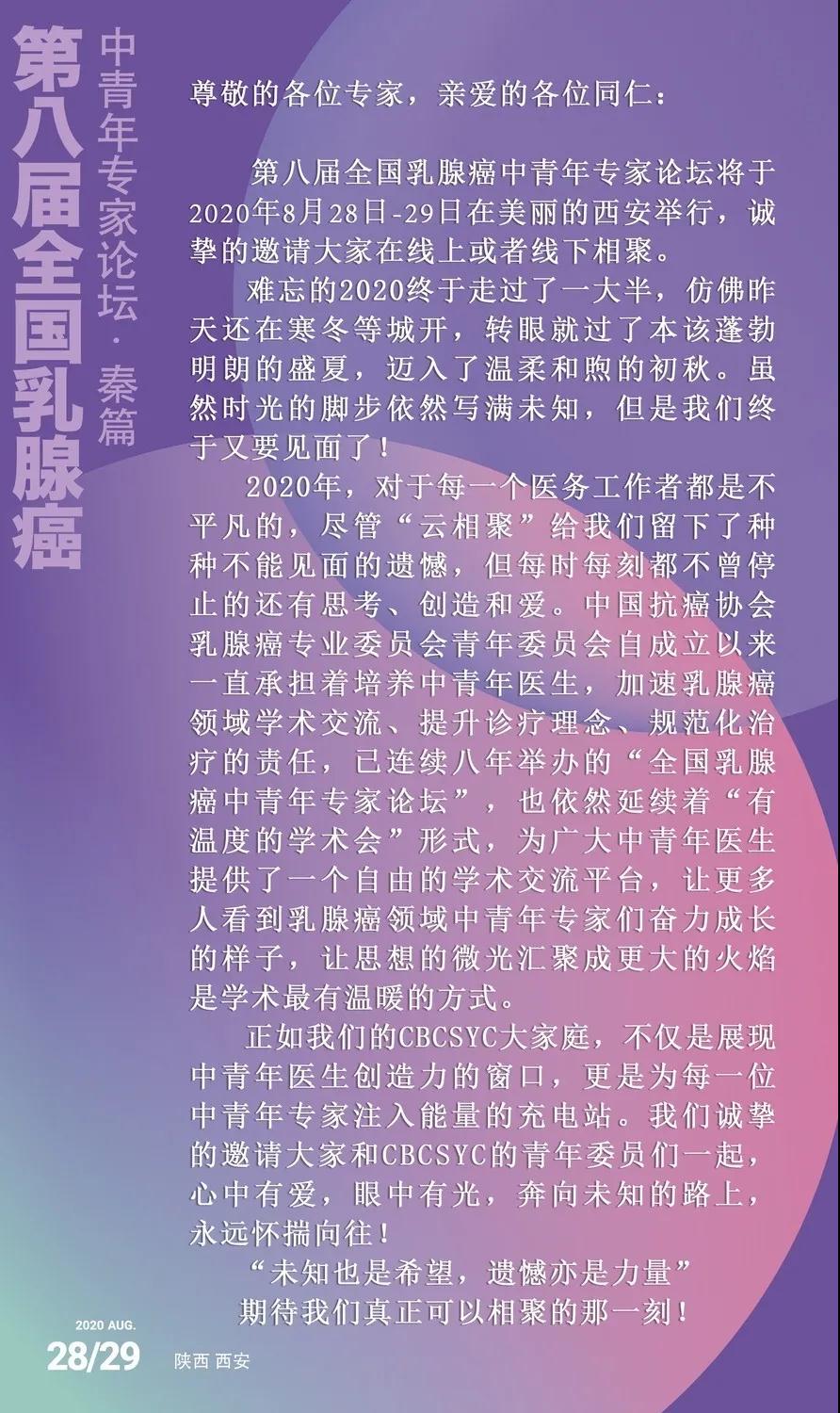 第八屆全國乳腺癌中青年專家論壇—秦篇,將于2020年8月28日至29日在西安召開,西安國際醫(yī)學(xué)中心腫瘤醫(yī)院作為東道主及協(xié)辦方,誠邀各位專家參加本次會議,也歡迎大家線上觀看本次學(xué)術(shù)盛宴,我們期待您的到來!