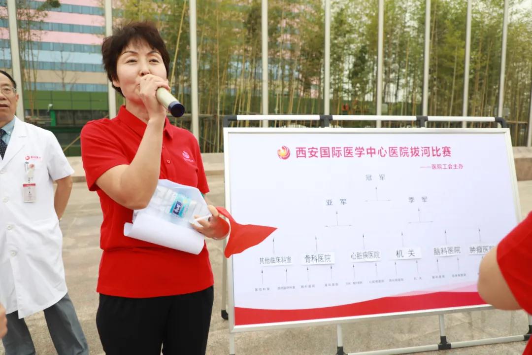 在院慶一周年之際,西安國(guó)際醫(yī)學(xué)中心醫(yī)院舉行“凝心聚力展風(fēng)采”拔河比賽,來(lái)自各機(jī)關(guān)部門、??漆t(yī)院、科室共有11支隊(duì)伍275名隊(duì)員參加。王志峰總經(jīng)理親臨現(xiàn)場(chǎng)觀摩活動(dòng)并為參賽隊(duì)員加油助威。