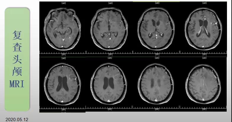 70歲的郝女士去年曾在外院查出“左額島葉”膠質(zhì)母細(xì)胞瘤(WHO Ⅳ級),并做了左側(cè)額島葉占位性病變切除術(shù)。術(shù)后進行了同步放化療。由于治療條件有限,郝女士慕名來到我院就診。賀世明主任率領(lǐng)醫(yī)護團隊立即為郝女士進行了全面的檢查,決定為其進行綜合治療 電場治療。經(jīng)過三個多月的綜合治療,患者復(fù)查頭顱MRI病變較前明顯縮小。出院時,郝女士神志清醒,睡眠飲食正常,說話很流利?!拔沂翘芍M來的,現(xiàn)在不用人攙扶,自己就可以走出病房了。”郝女士拉著醫(yī)護人員的手說。