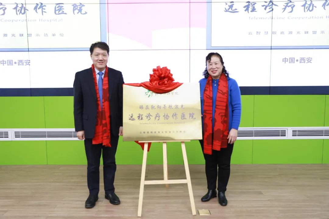 尹強(qiáng)院長(zhǎng)、陳有信教授、嚴(yán)宏教授、王從毅教授、倪偉主任、朱琰經(jīng)理共同啟動(dòng)“5G眼底導(dǎo)航激光”光球;陳有信教授、倪偉主任為“北京協(xié)和醫(yī)院與西安國(guó)際醫(yī)學(xué)中心醫(yī)院眼底靶向?qū)Ш郊す膺h(yuǎn)程診療協(xié)作醫(yī)院”共同揭牌。
