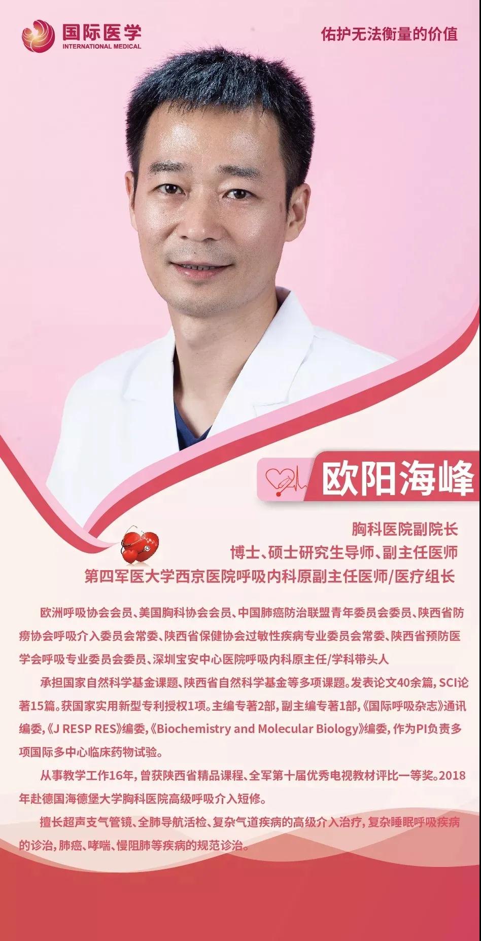 他叫歐陽海峰,中國肺癌防治聯盟青年委員會委員、陜西省醫(yī)師協會微無創(chuàng)醫(yī)學專業(yè)委員會常委、西安國際醫(yī)學中心醫(yī)院胸科醫(yī)院副院長。