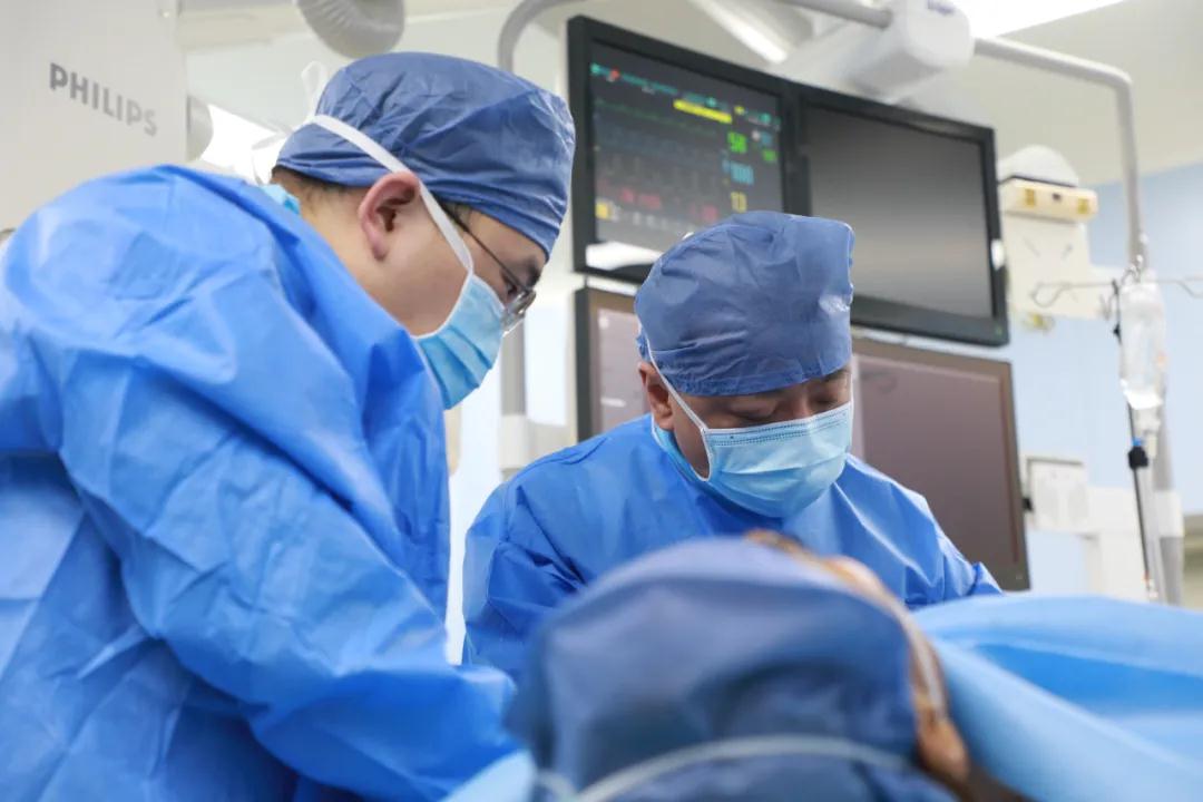 按照術(shù)前制定的方案,郭穎強主任和楊金保博士首先嘗試開通閉塞的右腎動脈,但由于血栓機化、鈣化嚴重,右腎動脈難以開通。遂謹慎擴張狹窄的左腎動脈,并成功植入一枚支架。之后經(jīng)過反復旋磨、抽吸,順利開通髂動脈,但腹主動脈閉塞段仍難以擴通。此時,患者居高不下的血壓很快恢復到正常水平。