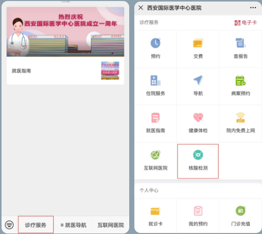 有需要住院、陪護(hù)的應(yīng)檢盡檢或愿檢盡檢人群,可關(guān)注“西安國(guó)際醫(yī)學(xué)中心醫(yī)院服務(wù)號(hào)”后,在【診療服務(wù)】——【核酸檢測(cè)】功能中自助開單,支付后前往西安國(guó)際醫(yī)學(xué)中心醫(yī)院急診門口預(yù)檢分診點(diǎn)北側(cè)核酸檢測(cè)室完成采樣檢測(cè)。檢測(cè)結(jié)果可在西安國(guó)際醫(yī)學(xué)中心醫(yī)院服務(wù)號(hào)——【診療服務(wù)】——【查報(bào)告】中查看,也可在“西安市民一碼通”——【核酸結(jié)果查詢】中查看。