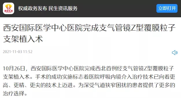 [老年健康?醫(yī)視界]西安國(guó)際醫(yī)學(xué)中心醫(yī)院完成經(jīng)支氣管鏡Z型覆膜粒子支架植入術(shù)
