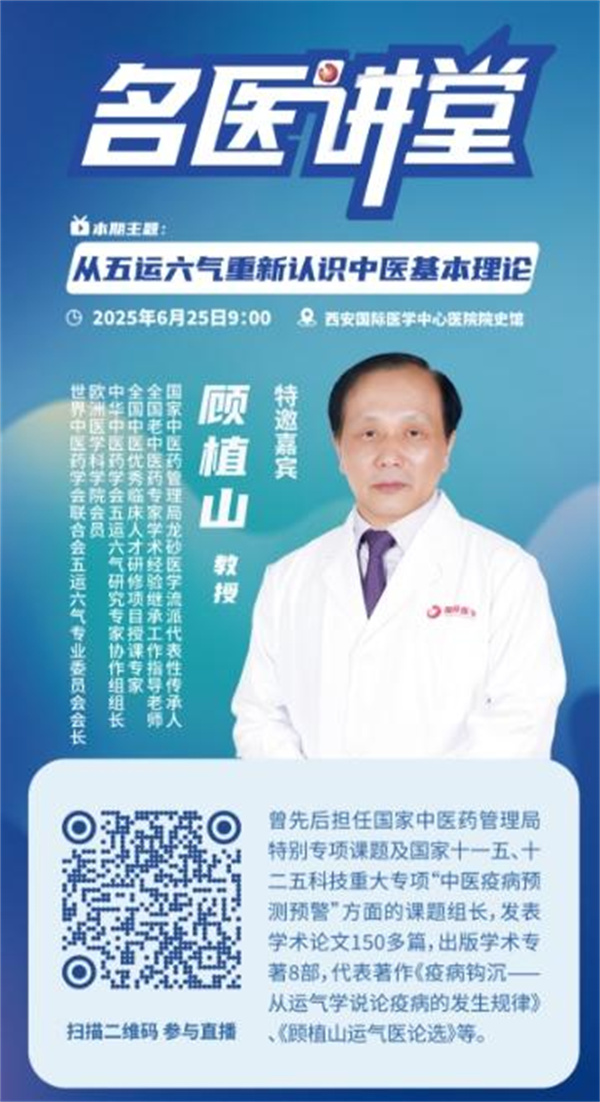6月25日上午,由西安國際醫(yī)學中心醫(yī)院主辦的"名醫(yī)講堂"系列學術活動在院史館舉行。本次講座邀請到國家中醫(yī)藥管理局龍砂醫(yī)學流派代表性傳承人顧植山教授,作《從五運六氣重新認識中醫(yī)基本理論》的專題報告。西安國際醫(yī)學中心醫(yī)院尹強院長、中醫(yī)醫(yī)院趙曉平院長、中醫(yī)二科卓鷹主任及科室醫(yī)護人員、百余名中醫(yī)從業(yè)者及愛好者參會學習,重新認識博大精深的中醫(yī)理論。