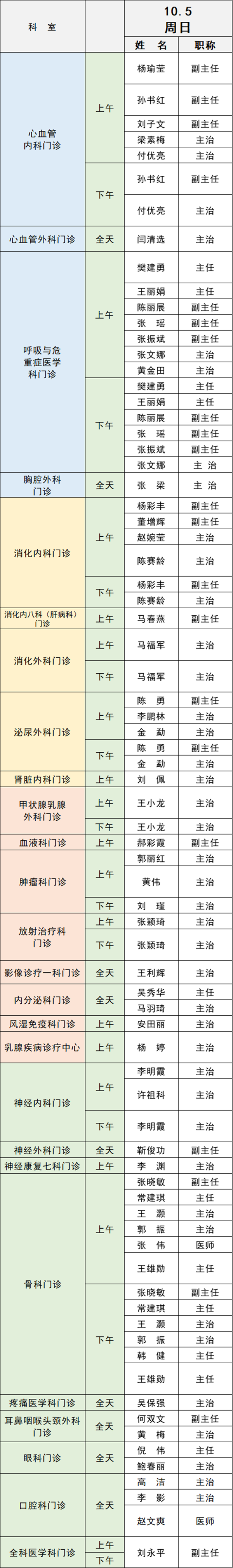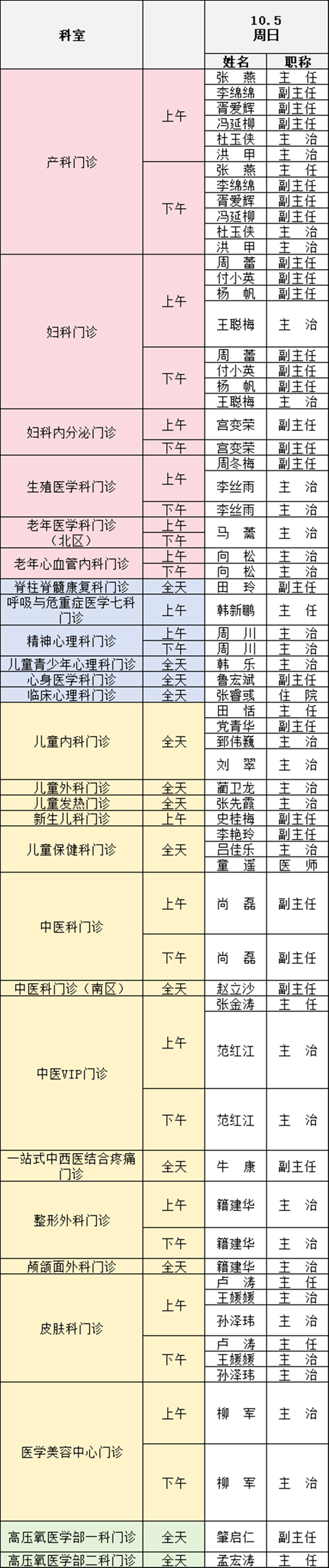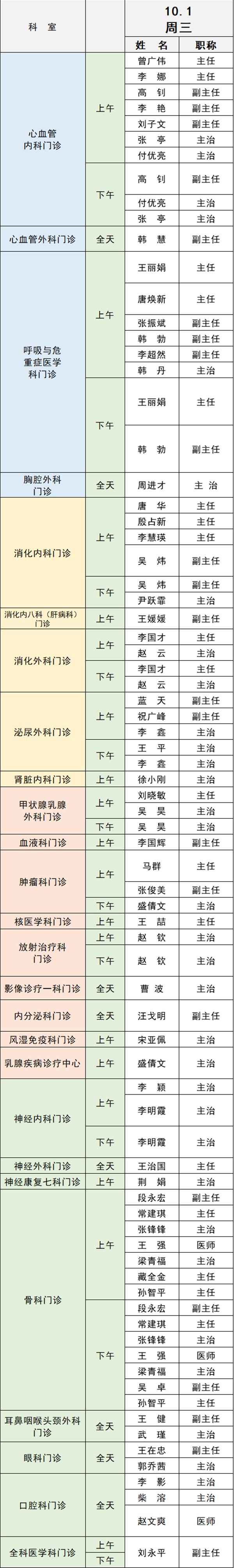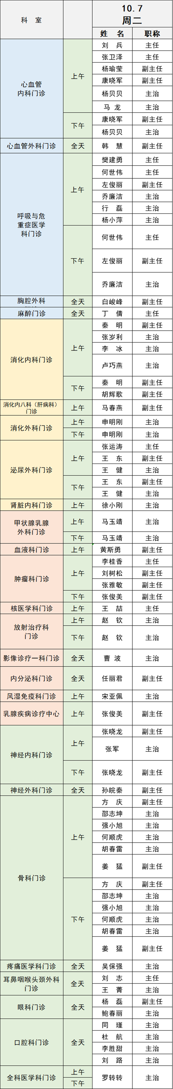 備注:實際出診情況以醫(yī)院掛號平臺實時信息為準。“職稱”欄里主任=主任醫(yī)師副主任=副主任醫(yī)師主治=主治醫(yī)師