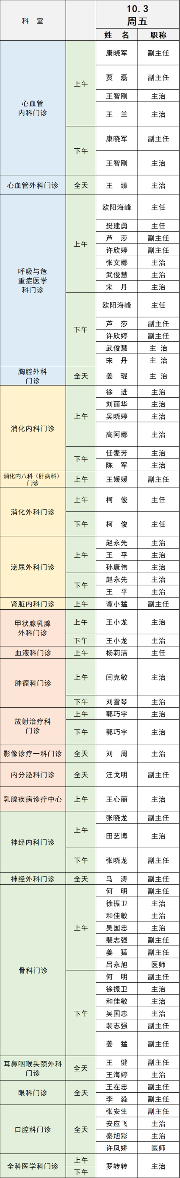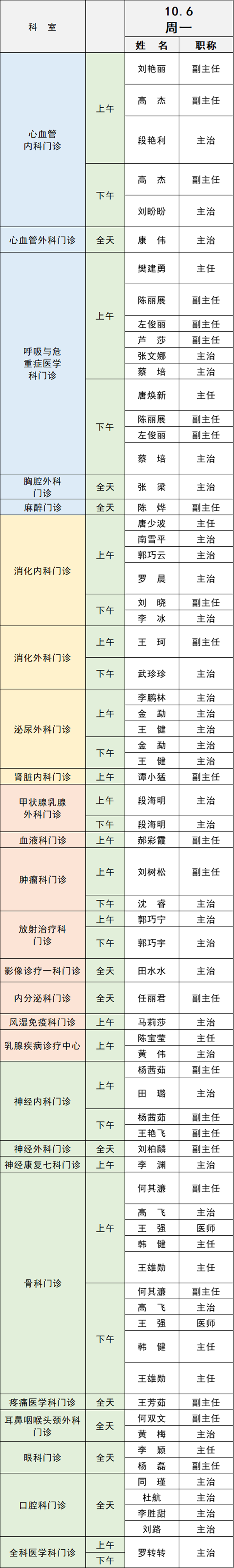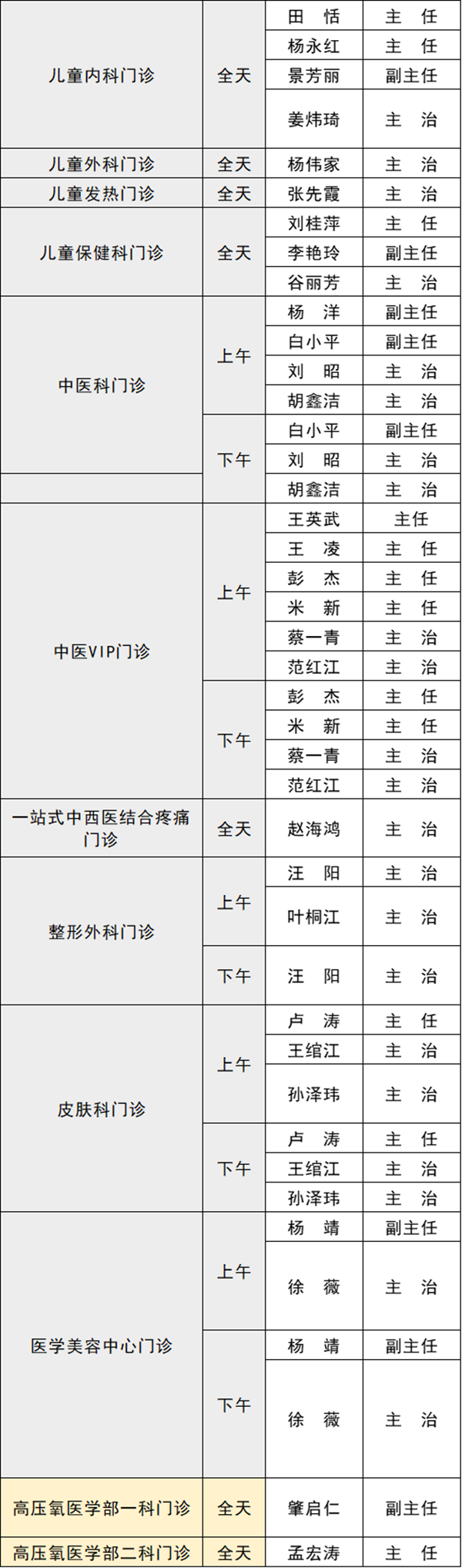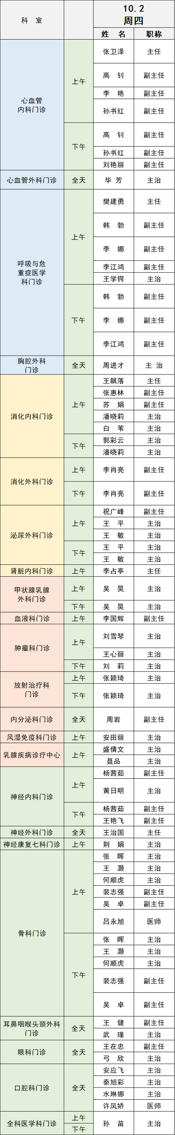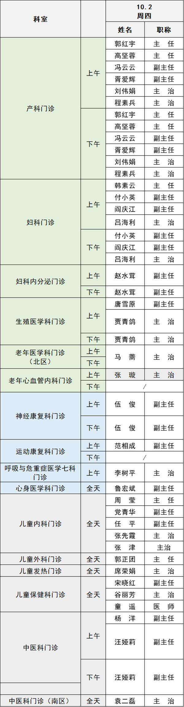 備注:實際出診情況以醫(yī)院掛號平臺實時信息為準。“職稱”欄里主任=主任醫(yī)師副主任=副主任醫(yī)師主治=主治醫(yī)師