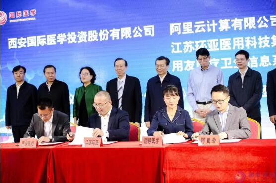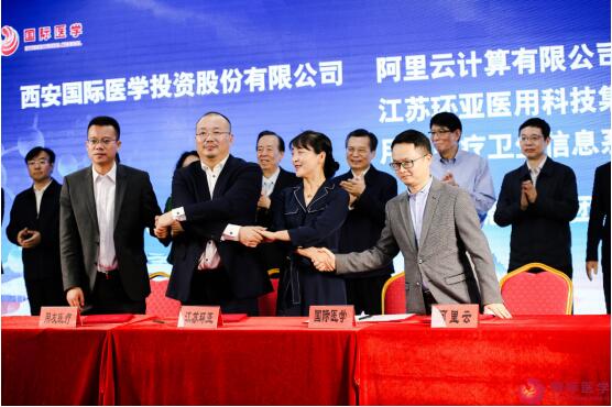 王永康書記等領(lǐng)導(dǎo)和嘉賓們首先參加了西安國(guó)際醫(yī)學(xué)中心的項(xiàng)目封頂儀式。在打造“ 一帶一路”國(guó)際醫(yī)療中心的啟動(dòng)儀式上,國(guó)際醫(yī)學(xué)董事長(zhǎng)史今代表公司與西安電子科技大學(xué)校長(zhǎng)楊宗凱、英國(guó)國(guó)王學(xué)院代表簽訂《共建國(guó)際醫(yī)學(xué)院合作框架協(xié)議》;與阿里云簽訂《落地實(shí)施協(xié)議》、與江蘇環(huán)亞簽訂《信息化合作協(xié)議》、與用友醫(yī)療簽訂《信息化集團(tuán)管控項(xiàng)目實(shí)施協(xié)議》。